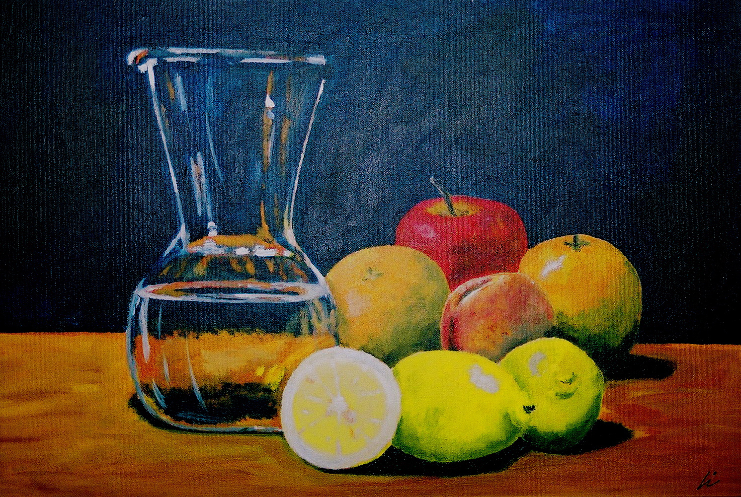 Angeles me encargó un bodegón para la cocina. En un principio no me gustó la idea, pues no le veo la gracia a un par de frutas o una botella semivacía. Pero insistió tanto que al final me atreví.
