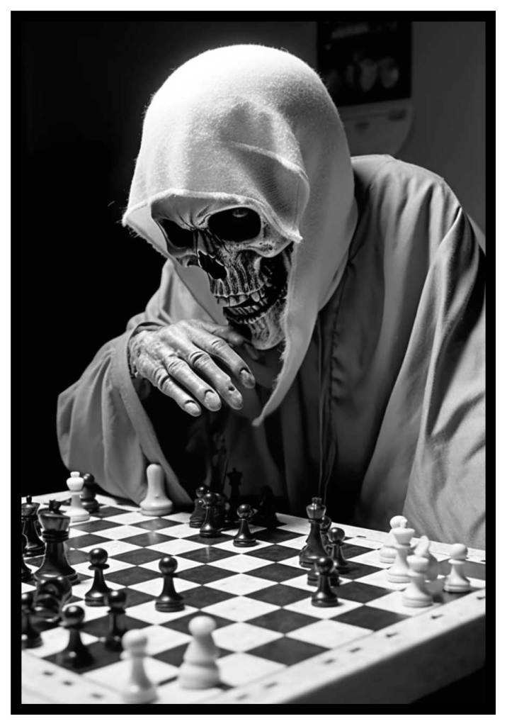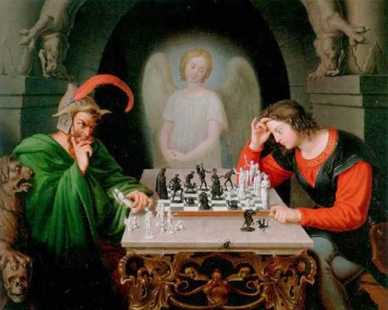 En definitiva, y volviendo a lo que nos interesa, ante la magnitud de la derrota, Meyer juró que vendería su alma al diablo si este le aseguraba que no perdería nunca más. Las crónicas cuentan que entonces se oyó una explosión y todo se llenó de humo. Cuando este se disipó, Herr Meyer había desaparecido y solo quedó como recuerdo suyo un tenue olor a azufre. El periódico seguía contando que varios mediums, entre ellos el Gran Kappel, famoso por haber inventado la predicción gracias a las arrugas que forman los nabos al cocerse y la conocidísima (y menospreciada en según que círculos brujeriles) Alanís Ferrer, afirmaban que Meyer seguía vivo en alguna parte, disputando una partida de ajedrez con la muerte: Si ganaba la partida tendría lo que había deseado, pero si perdía, también perdería su alma.