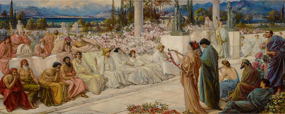 Las alumnas, vestidas con hermosos peplos color de leche y coronadas de rosas y jazmines, estaban engalanando una estatua de Afrodita. Le colocaban guirnaldas y quemaban incienso a su alrededor. Eran jóvenes orgullosas de pertenecer a la escuela, pues esta era muy famosa y respetable. Hacía ya años que las familias más importantes competían para que alguna de sus hijas pudiera ser aceptada en ella. Todas no lo conseguían, tenían que tener talento y tenían que mantenerse puras, no era necesario que fueran vírgenes o que se consagraran a la diosa, pero no debían amar a ningún hombre y el matrimonio ocasionaba la expulsión inmediata.