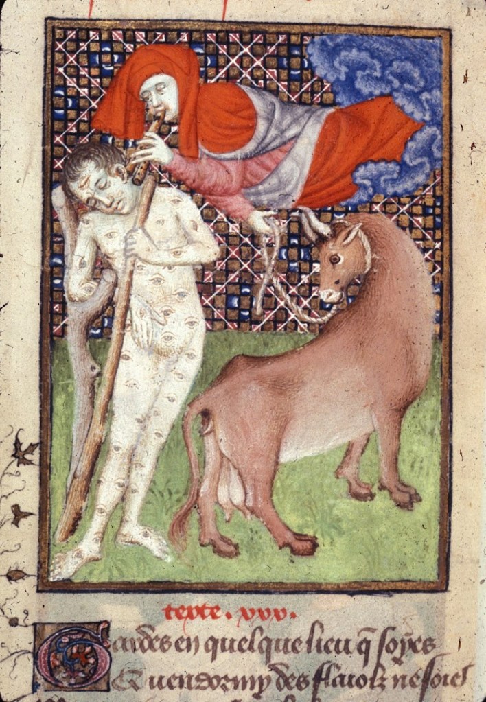 Más tarde, el divinal Ovidio nos cuenta quién es Argo, el de los cien ojos (“centum luminibus cinctum caput Argus habebat”, Metamorfosis – 625, o sea, para los que no saben latín, «de cien luces ceñida su cabeza Argos tenía«) y, con unas imágenes muy gráficas, nos narra como Io pide clemencia pero en lugar de palabras de su boca sólo salen mugidos. Parece perdida para siempre, allá en las montañas, vigilada eternamente por el gigante; pero Júpiter quiere recuperarla y envía a su hijo Mercurio, quien finalmente duerme a Argo tocando su flauta. En este punto, Ovidio intercala la historia de Pan i Siringa, aprovechando el comentario sobre la flauta (“namque reperta fistula nuper erat, qua sit ratione reperta”, Metamorfosis – 687 a 688, en castellano: «…descubierta la flauta hacía poco había sido, en razón de qué fue descubierta«), y a continuación nos detalla la loca huida de Io hasta llegar a Egipto donde recupera el aspecto humano y da a luz a Épafo.