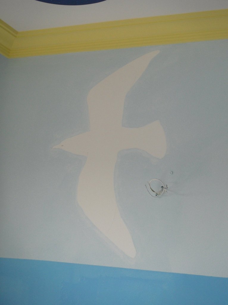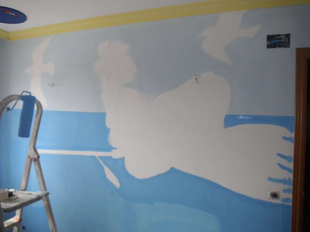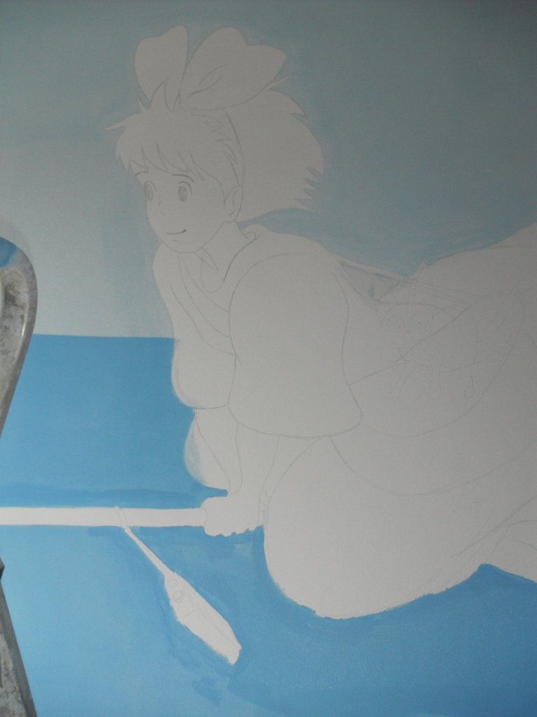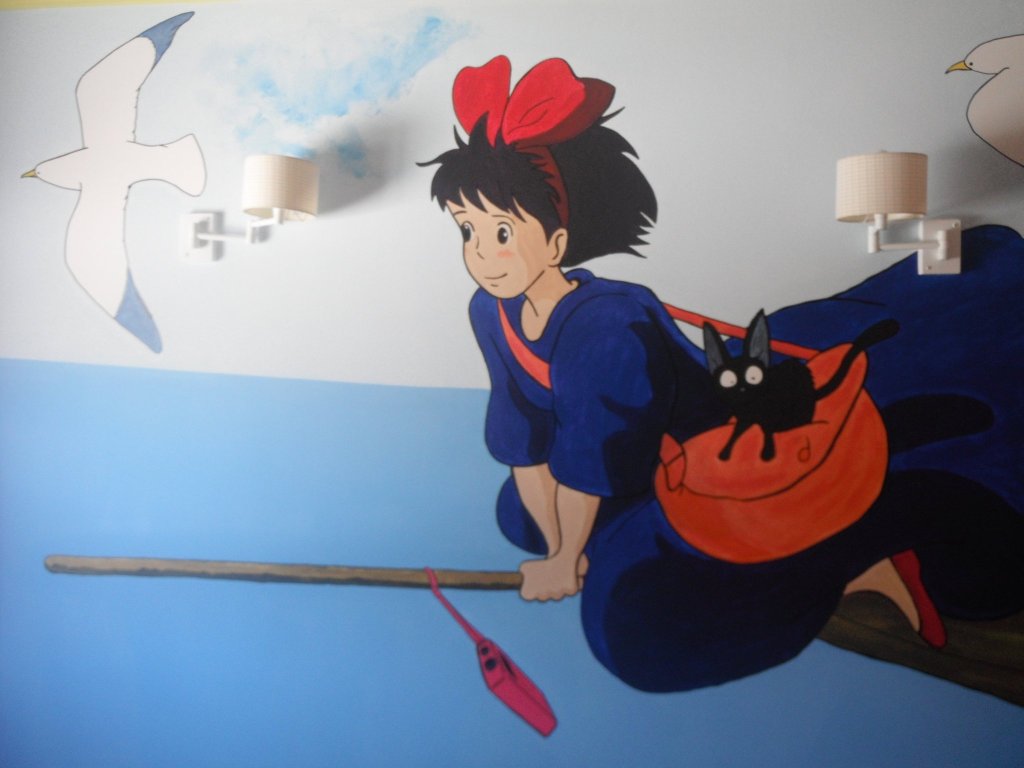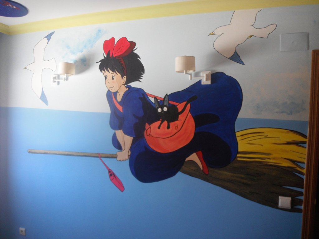 Hasta que mi hija Clàudia tuvo 10 años en su habitaicón había un elefante azul y una vaca lila, además de otros animales… ya empezaban a estar desfasados. Le pregunté que quería y me pidió que le pintara a Nicky, la brujita de Miyazaki (魔女の宅急便 , Majo no takkyūbin, 1989).