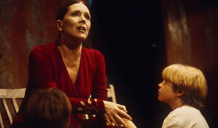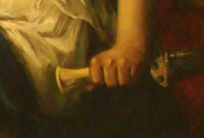 Ya he dicho que esta Medea parece huir de alguien que no vemos, ahora bien, ¿Quién es ese alguien? ¿Medea está protegiendo a sus hijos de alguien que quiere asesinarlos? ¿Por qué mira asustada hacia el exterior de la cueva? ¿Está huyendo de alguien que quiere evitar que los asesine? En el primer caso el cuchillo es el arma defensiva, en el segundo, la homicida.