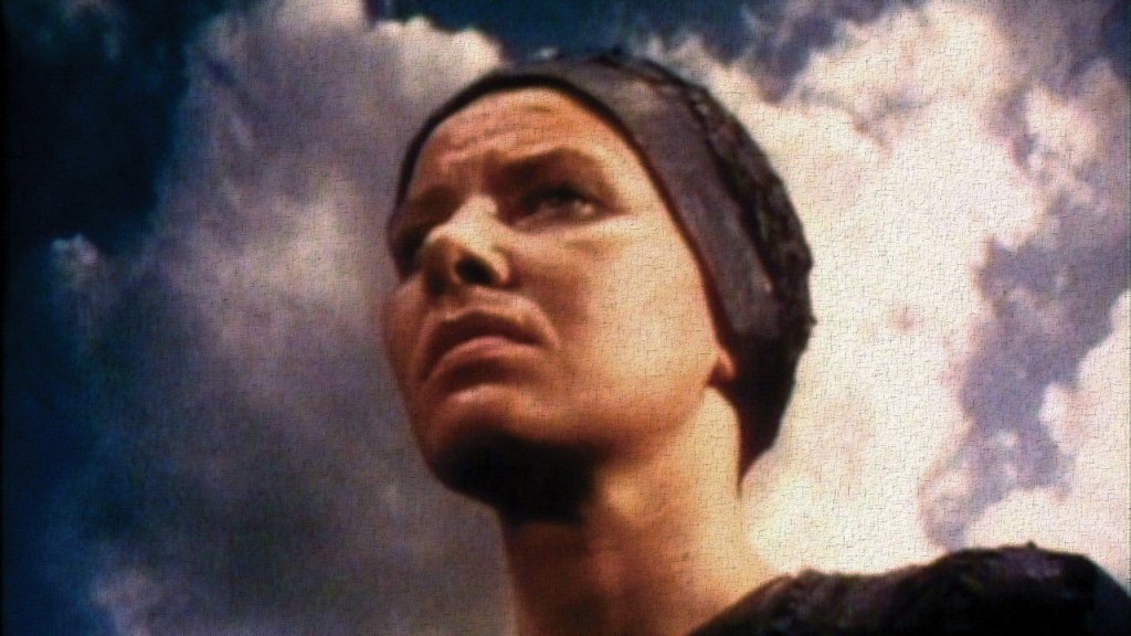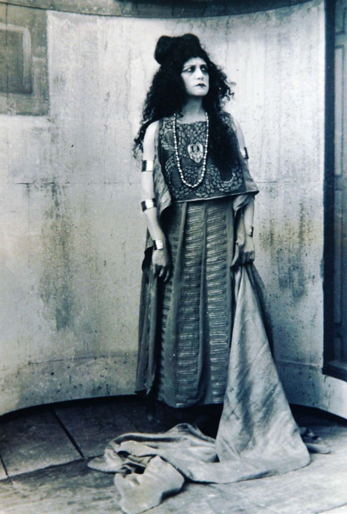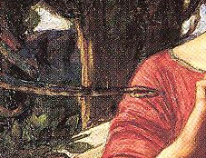 Jasón aparece como asustado, quieto, con los pies juntos, las manos agarrando con fuerza la lanza… todo lo contrario de un héroe y todo lo contrario de Medea, que aparece luminosa, segura de sí misma, potente, poderosa, solemne, dominante y tranquila. No muestra miedo ni temor (parece estar contando las gotas de la poción, eso sí, para no equivocarse, suponemos).