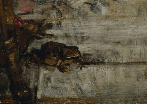 La simbología de los elementos acompañan esta imagen son típicos de la brujería: la serpiente grabada en el mármol, la que aparece en una especie de columna que tiene detrás; la rana, ingrediente habitual de los brebajes de las hechiceras. En la pintura también salen una olla y otros utensilios habituales en la simbología brujeril.