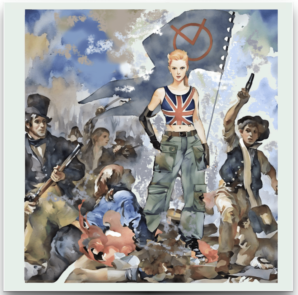 La Libertad Guiando al Pueblo (Eugène Delacroix – 1830), reinterpretada com El Espíritu del Siglo XX, simbolitzando el papel de Jenny Sparks com fuerza transformadora del siglo XX: audaz, disruptiva, cínica y líder innata.