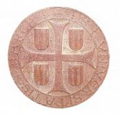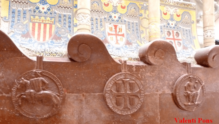 Medallón 5: se ven unos escudos con tres palos y rodeando una cruz. El texto es S. VNIVERSITATIS BARCH.; o sea Sello de la Universidad de Barcelona. Es un sello perfectamente documentado de 1289.