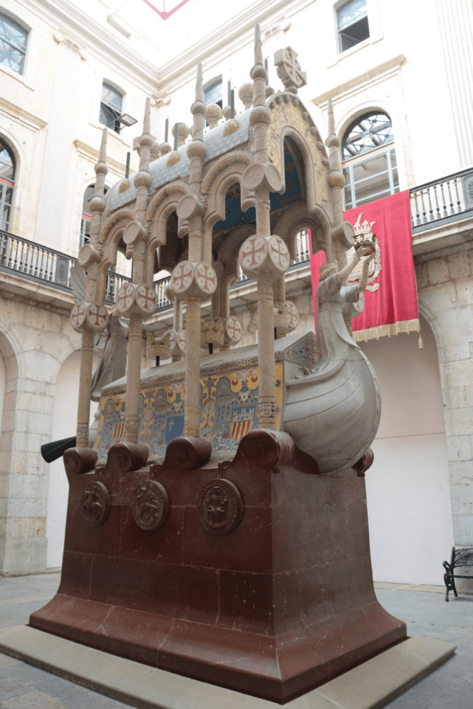 Está fabricada con una piedra caliza de color granate (llamada rojo bilbao) que aporta reminiscencias del pórfido, tan utilizado en el arte bizantino. La base tiene unas ondas en la parte superior, que representan el mar donde navega el barco mortuorio; de estas volutas salen las ocho columnas que aguantan el baldaquín. Casi no tiene decoración, simplemente cuatro sellos reales y dos institucionales, aunque un pequeño detalle se observa en las olas de proa, donde se ven unas hojas indeterminadas que pueden ser de hiedra o de viña.