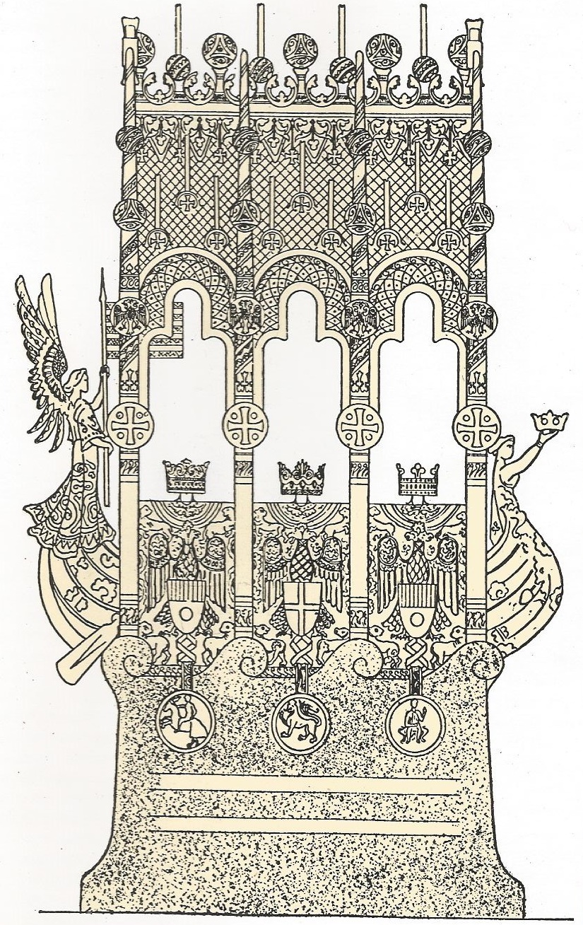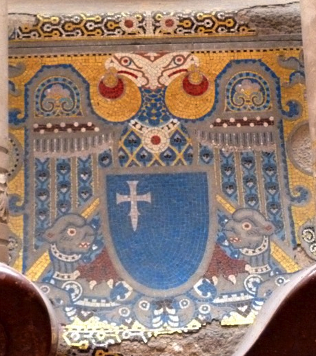 Estas investigaciones son lo que determinó la estética decorativa de sus obras y el uso de escudos y objetos del imaginario heráldico. En el caso que nos ocupa, hay seis medallones en la base del monumento que reproducen seis sellos reales: