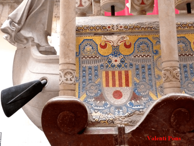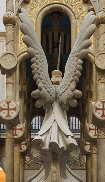 Un león o un oso también son símbolos de poder, pero el águila, además del poder civil o militar, tiene el religioso; y al asumir estas dos vertientes se convierte en águila bicéfala. En el caso que nos ocupa, como ya he dicho antes, las águilas del mausoleo están directamente inspiradas en la casulla de Sant Bernat Calbó. Esta casulla es conocida como el Tejido de las Águilas y sirvió de inspiración a Lluís Domènech i Muntaner; las razones parecen ser diversas: una es el acceso a un tejido de la misma época que quería representar en el mausoleo, otra es su afición por la heráldica y la Cataluña medieval, y la tercera, y creo que más importante, es el hecho de que, según nos cuenta la tradición, el Tejido de las Águilas formó parte del botín de guerra que consiguió Jaume I cuando conquistó València; y no olvidemos que obispo Bernat Calbó también participó en la expedición.