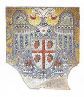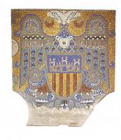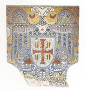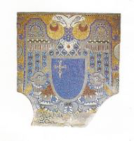Aparte de los medallones están los seis escudos que ocupan el «tapiz cerámico» que cubre el féretro. Estos escudos son los que están custodiados por águilas bicéfalas y hacen referencia a los títulos y las jerarquías que ostentaba el monarca.