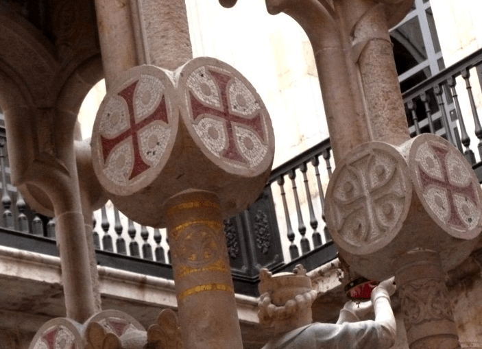 Esta relación de Jaume I con los Templarios, Domènech i Montaner la simboliza con el gran número de cruces templarias rojas que aparecen en el monumento, aunque no está de más recordar que este tipo no fue usado de forma sistemática por los templarios, ya que la cruz roja que usaban ellos no tenía un diseño específico.