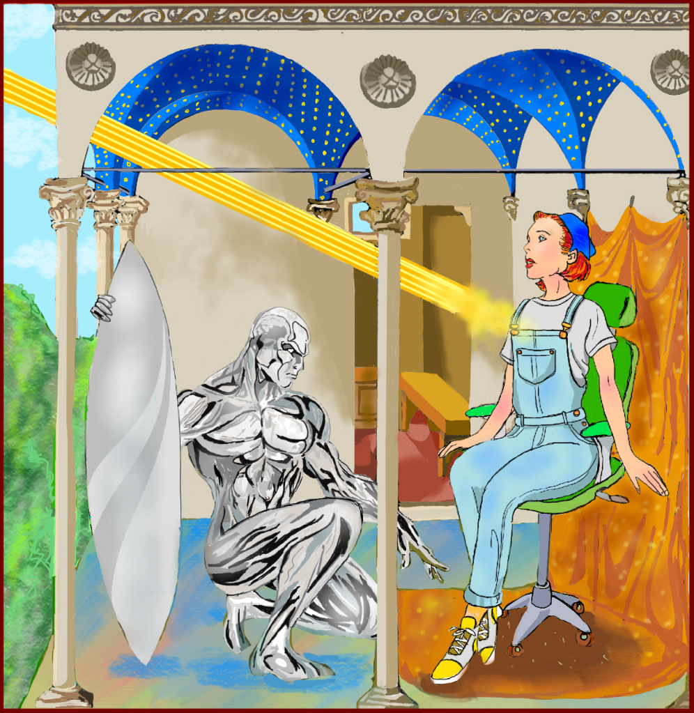 Silver Surfer ocupa exactamente esa posición. No es el destinatario del mensaje, sino el mensajero cósmico: la figura que precede a la catástrofe y anuncia la llegada de Galactus. Como el ángel de Fra Angelico, Silver Surfer es una presencia luminosa y solitaria, investida de una autoridad que no le pertenece por completo. Su poder no es propio; es delegado.