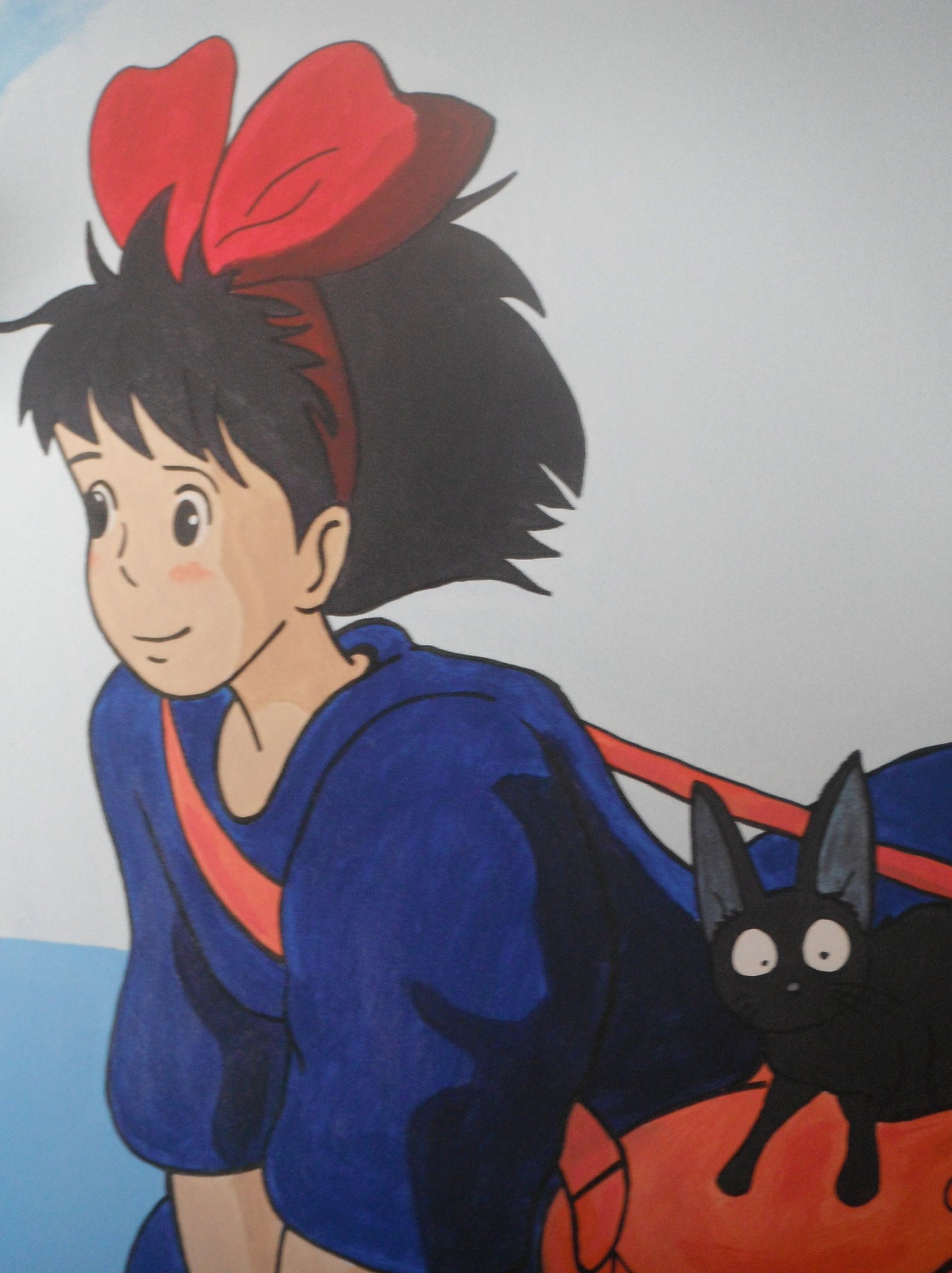 Hasta que mi hija Clàudia tuvo 10 años en su habitaicón había un elefante azul y una vaca lila, además de otros animales… ya empezaban a estar desfasados. Le pregunté que quería y me pidió que le pintara a Nicky, la brujita de Miyazaki (魔女の宅急便 , Majo no takkyūbin, 1989).